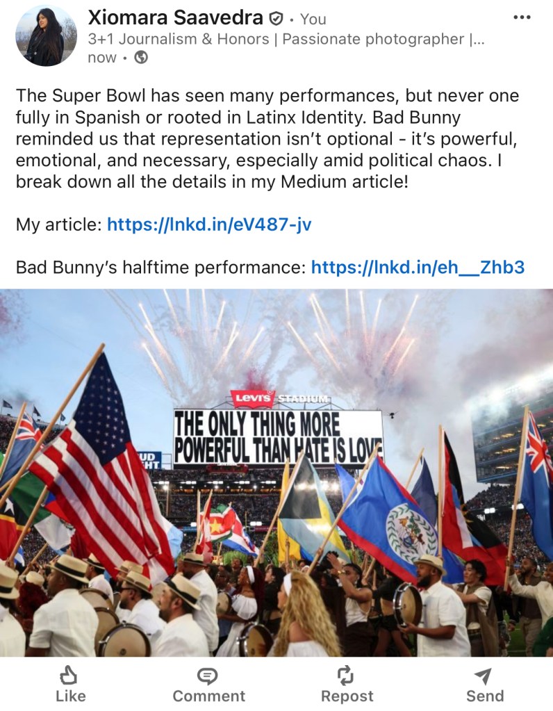 I opened with the claim that the Super Bowl had never seen a performance fully in Spanish or so deeply rooted in Latinx identity to establish context immediately.
