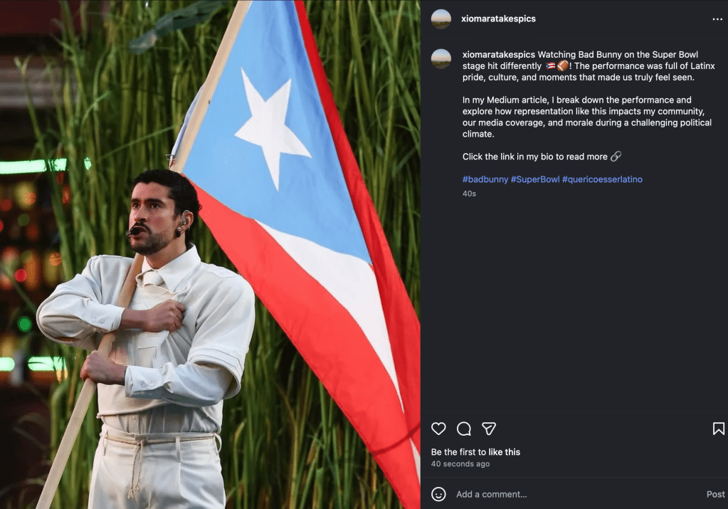 I chose the close up image of Bad Bunny holding the Puerto Rican flag because it fits Instagram’s format and captures pride, resistance, and identity in one frame. The flag is not just a backdrop, it is a statement.