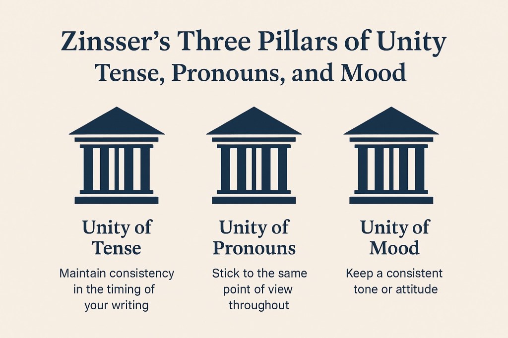 Zinsser’s message is not that writing must be rigid, but that it must be intentional. When you commit to a tense, a set of pronouns, and a consistent mood, you create a piece of writing that feels centered and confident.